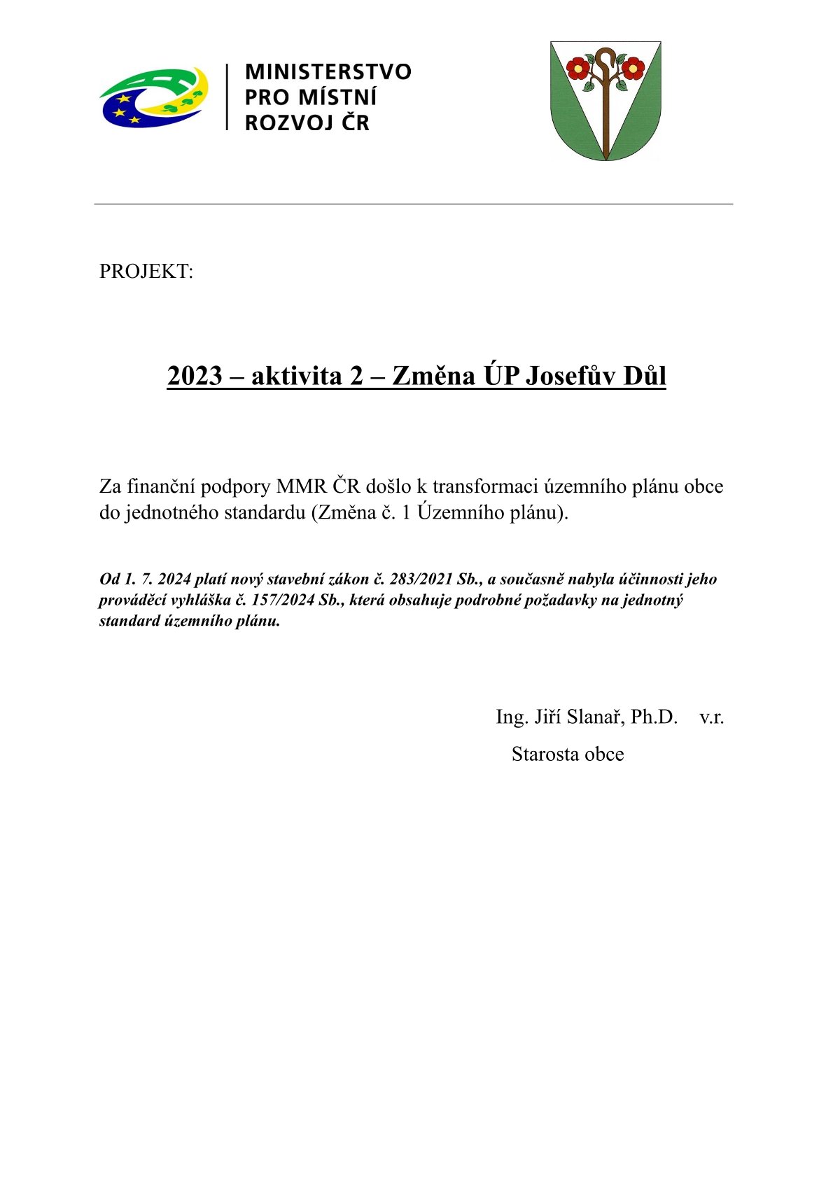 Projekt: 2023 - aktivita2 - Změna územního plánu Josefův Důl Za finanční podpory MMR ČR došlo k tranformaci územního polánu obce do jednotného standardu